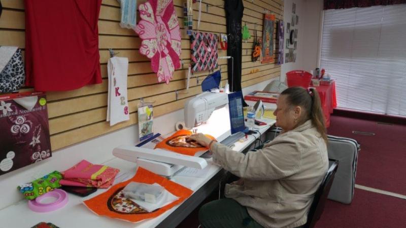 For this project, Connie taught us how to use the circular attachment to create perfect circles and semi-circles. We explored the EPIC’s decorative stitches for quilting and applique to add some customized, personal details to the finished piece. Then, we finished it all up by quilting in the hoop – using Viking’s exclusive metal hoop!