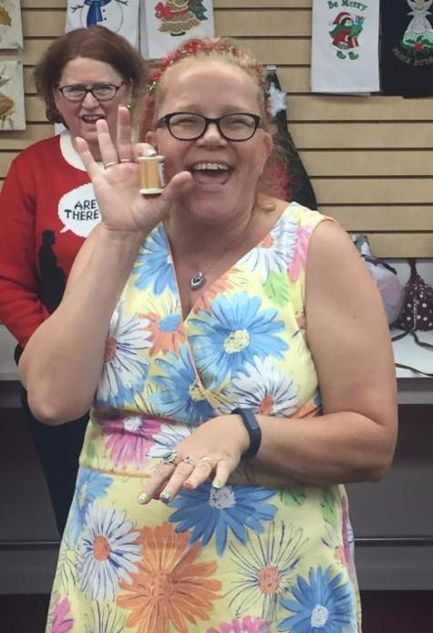 Since we were celebrating Christmas in July – there were gifts! Everyone who wore red for the festivities received a free spool of thread in addition to numerous door prizes. The big winner of the night at Luke’s Elsmere was Anna M! She went home with a collection of Hope Yoder designs, a collection of Iris thread, and a pair of applique scissors  – worth over $550! Wow! Congrats Anna!